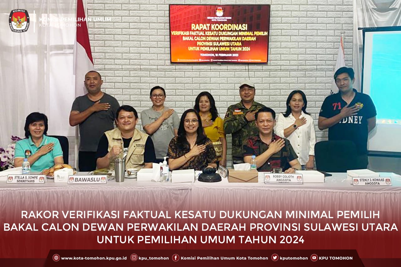 Tomohon, kota-tomohon.kpu.go.id - KPU Kota Tomohon menggelar Rapat Koordinasi Verifikasi Faktual Kesatu Dukungan Minimal Pemilih Bakal Calon Dewan Perwakilan Daerah Provinsi Sulawesi Utara untuk Pemilihan Umum Tahun 2024 bersama Bawaslu Tomohon yang dihadiri oleh Irvan Dokal dan LO Bakal Calon Anggota DPD Provinsi Sulawesi Utara, bertempat di Kantor KPU Kota Tomohon, Sabtu (18/2).