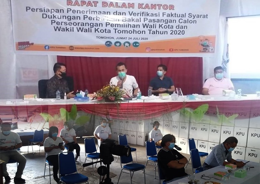 Komisi Pemilihan Umum (KPU) Kota Tomohon melaksanakan Rapat dalam Kantor (RDK) terkait persiapan penerimaan dan verifikasi faktual syarat dukungan perbaikan bakal pasangan calon perseorangan dalam pemilihan wali kota dan wakil wali kota Tomohon tahun 2020, Jumat (24/07/2020).
