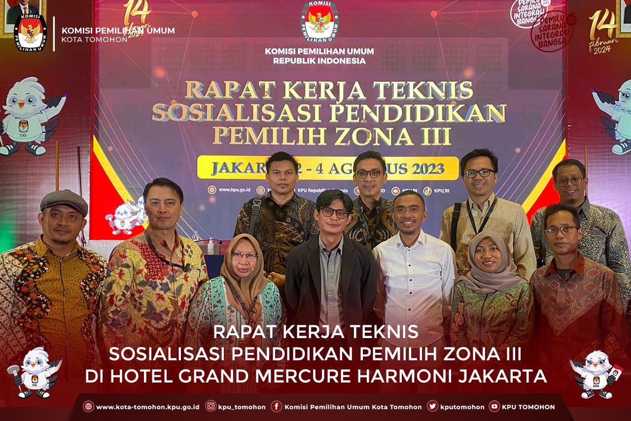 Tomohon, kota-tomohon.kpu.go.id - Ketua Divisi Sosialisasi, Pendidikan Pemilih, Partisipasi Masyarakat dan SDM KPU Kota Tomohon Rojer R. Datu didampingi oleh Kasubag Sosdikli Parmas dan Teknis Penyelengara Oliva Pusung hadir dan mengikuti kegiatan Rapat Kerja Teknis Sosialisasi dan Pendidikan Pemilih Zona III, di Jakarta, Rabu (2/8/2023).