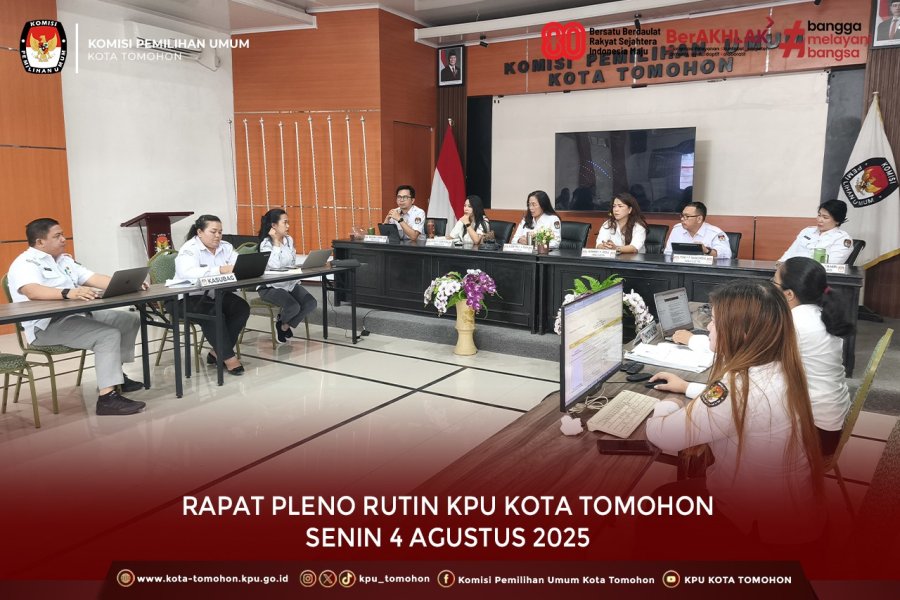 Tomohon, kota-tomohon.kpu.go.id - KPU Kota Tomohon melaksanakan Rapat Pleno Rutin pada Senin 4 Agustus 2025, bertempat di Aula KPU Kota Tomohon. Rapat ini dihadiri oleh Komisioner, Sekretaris dan para Kepala Sub Bagian KPU Kota Tomohon.