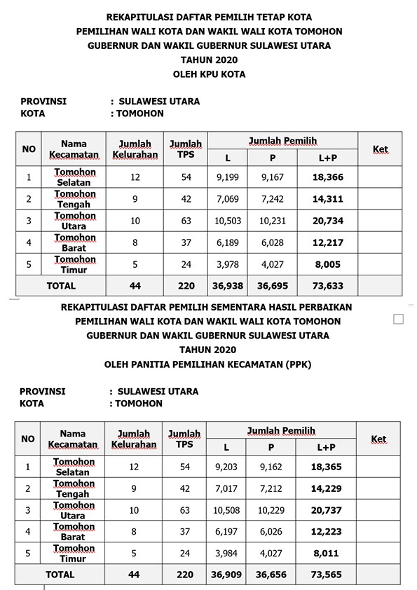 Rekapitulasi daftar pemilih sementara hasil perbaikan yang disampaikan oleh PPK se-kota Tomohon tentunya bukanlah menjadi hasil akhir yang akan disampaikan juga di tingkat kota Tomohon. Hasil akhir di tingkat kota Tomohon sangat berbeda dengan yang disampaikan di tingkat kecamatan terkait data pencermatan terhadap rekomendasi Bawaslu Tomohon. Selain itu, KPU Tomohon menindaklanjuti PKPU No. 17 Tahun 2020 terkait pemutakhiran data dan penyusunan daftar pemilih yang berada di Lembaga Pemasyarakatan.