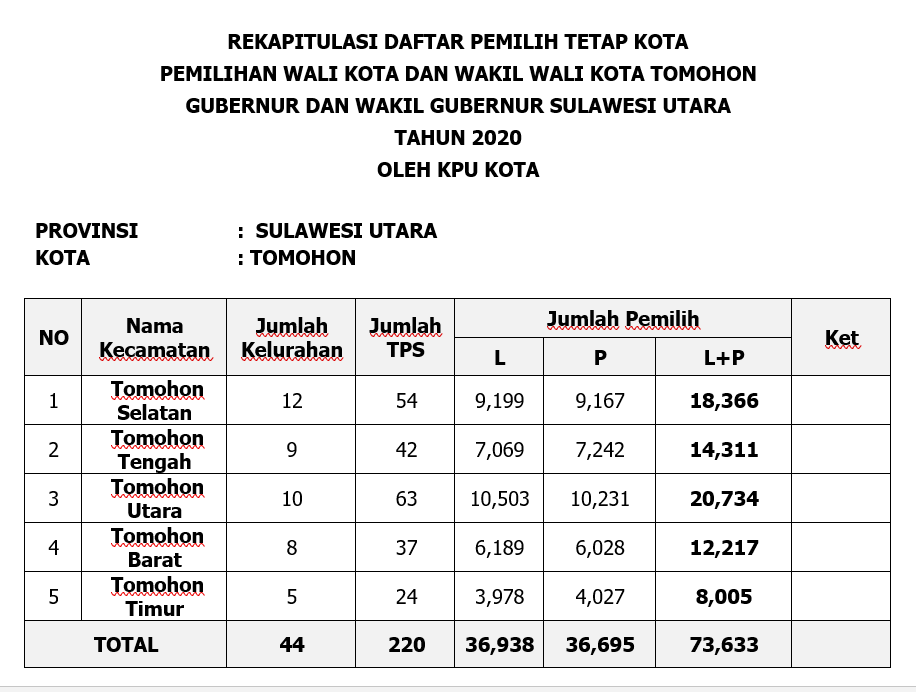 Selanjutnya pembacaan Hasil Rekapitulasi Daftar Pemilih Tetap Kota Pemilihan Wali Kota dan Wakil Wali Kota Tomohon serta Gubernur dan Wakil Gubernur Sulawesi Utara Tahun 2020, oleh Komisioner Divisi Perencanaan, Data dan Informasi, Albertien V. Pijoh. Dengan hasil sebagai berikut: