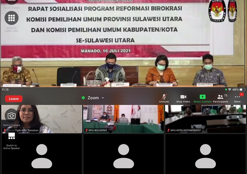 Jumat, 16 Juli 2021. KPU Provinsi Sulawesi Utara menggelar Rapat Sosialisasi Reformasi Birokrasi di Lingkungan KPU Provinsi Sulawesi Utara yang diikuti secara daring oleh Ketua dan Anggota KPU, Sekretaris, serta Kasubbag Keuangan, Umum dan Logistik di 15 Kabupaten/Kota. Rapat dibuka oleh Dr. Ardilles M. R. Mewoh, S.IP, M.Si selaku Ketua KPU Provinsi Sulawesi Utara, dilanjutkan dengan arahan dari Komisioner KPU Provinsi berturut- turut: Ketua Divisi Teknis Penyelenggara - Ibu Yessy Y. Momongan, S.Th, M.Si, Ketua Divisi Hukum dan Pengawasan Bpk Meidy Y. Tinangon, S.Si, M.Si dan Ketua Divisi Sosialisasi, Pendidikan Pemilih, Partisipasi Masyarakat dan SDM - Bpk. Salman Saelangi, S.Kel. Dalam sambutan sekaligus arahan singkatnya, Mewoh menyampaikan bahwa KPU Provinsi Sulawesi Utara merupakan salah satu dari dari 10 (sepuluh) provinsi di Indonesia yang menjadi Pilot Project Program Reformasi Birokrasi.