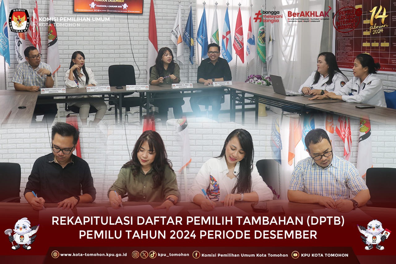 Tomohon, kota-tomohon.kpu.go.id - KPU Kota Tomohon telah melaksanakan Rapat Pleno Rekapitulasi Daftar Pemilih Tambahan (DPTb) untuk Periode Bulan Desember 2023 yang diakhiri dengan penandatanganan BA Pleno dan Rekapitulasi oleh Anggota Arinny Y. Poli, Deisy T. Soputan, Rojer R. Datu dan Youne Y. P. Simangunsong.