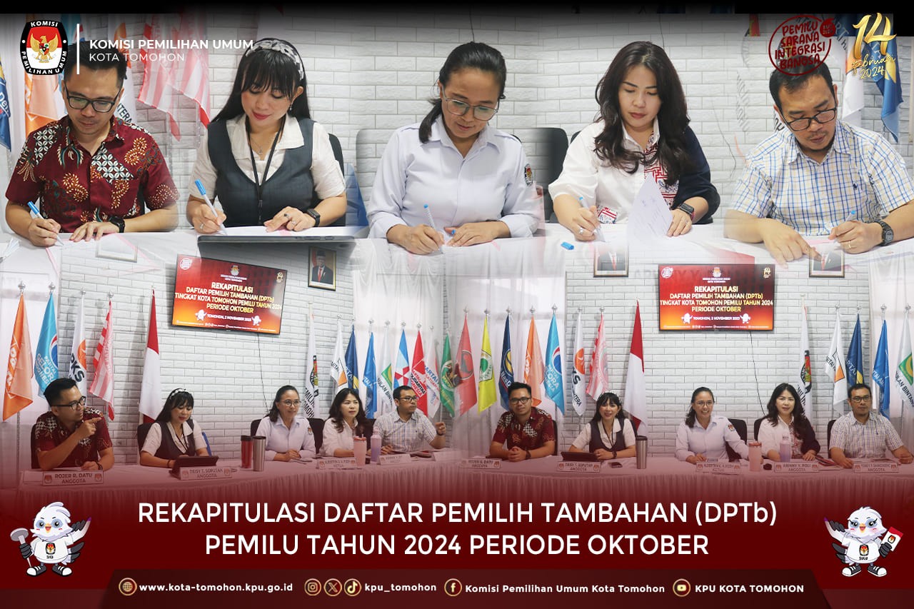 Tomohon, kota-tomohon.kpu.go.id - KPU Kota Tomohon telah melaksanakan Rapat Pleno Rekapitulasi Daftar Pemilih Tambahan (DPTb) untuk Periode Bulan Oktober 2023 yang diakhiri dengan penandatanganan BA Pleno oleh Ketua Albertien G. V. Pijoh, Anggota Arinny Y. Poli, Deisy T. Soputan, Rojer R. Datu dan Youne Y. P. Simangunsong.