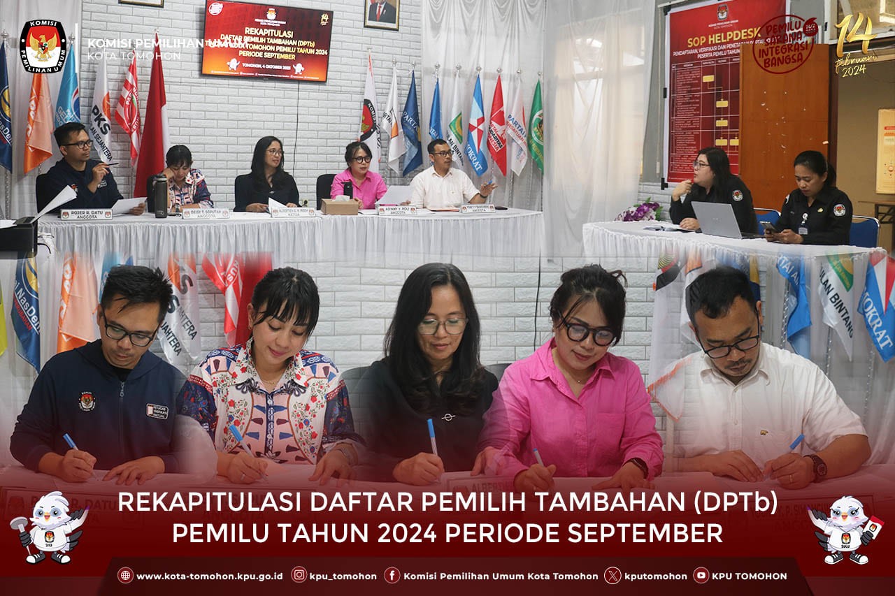 Tomohon, kota-tomohon.kpu.go.id - KPU Kota Tomohon telah melaksanakan Rapat Pleno Rekapitulasi Daftar Pemilih Tambahan (DPTb) untuk Periode Bulan September 2023 yang diakhiri dengan penandatanganan BA Pleno oleh Ketua dan Anggota KPU Kota Tomohon.