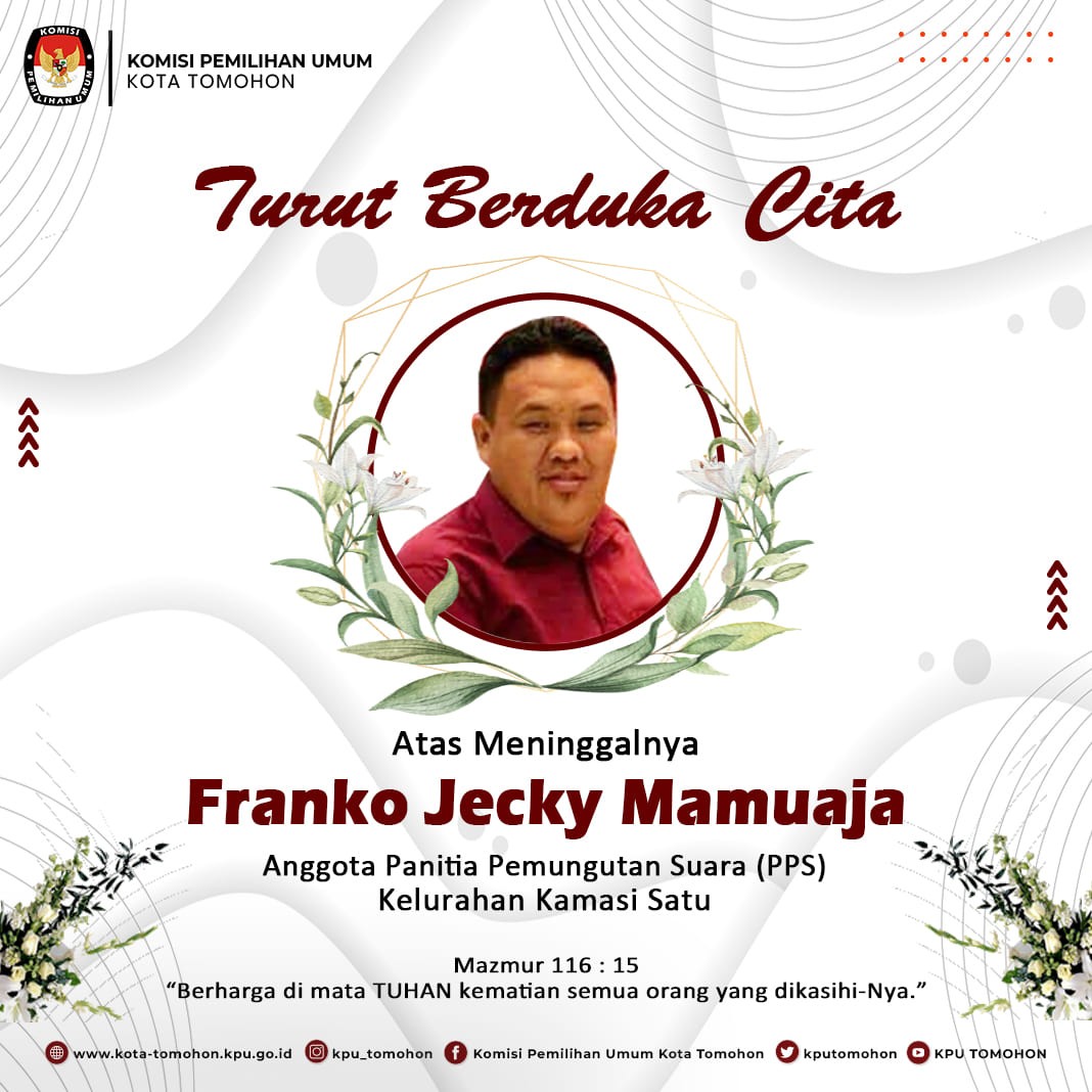 Keluarga Besar Komisi Pemilihan Umum Kota Tomohon menyampaikan Turut Berduka Cita atas meninggalnya Anggota Panitia Pemungutan Suara (PPS) Kelurahan Kamasi Satu Franko Jecky Mamuaja, Semoga keluarga yang ditinggkalkan diberikan kekuatan dan ketabahan.
