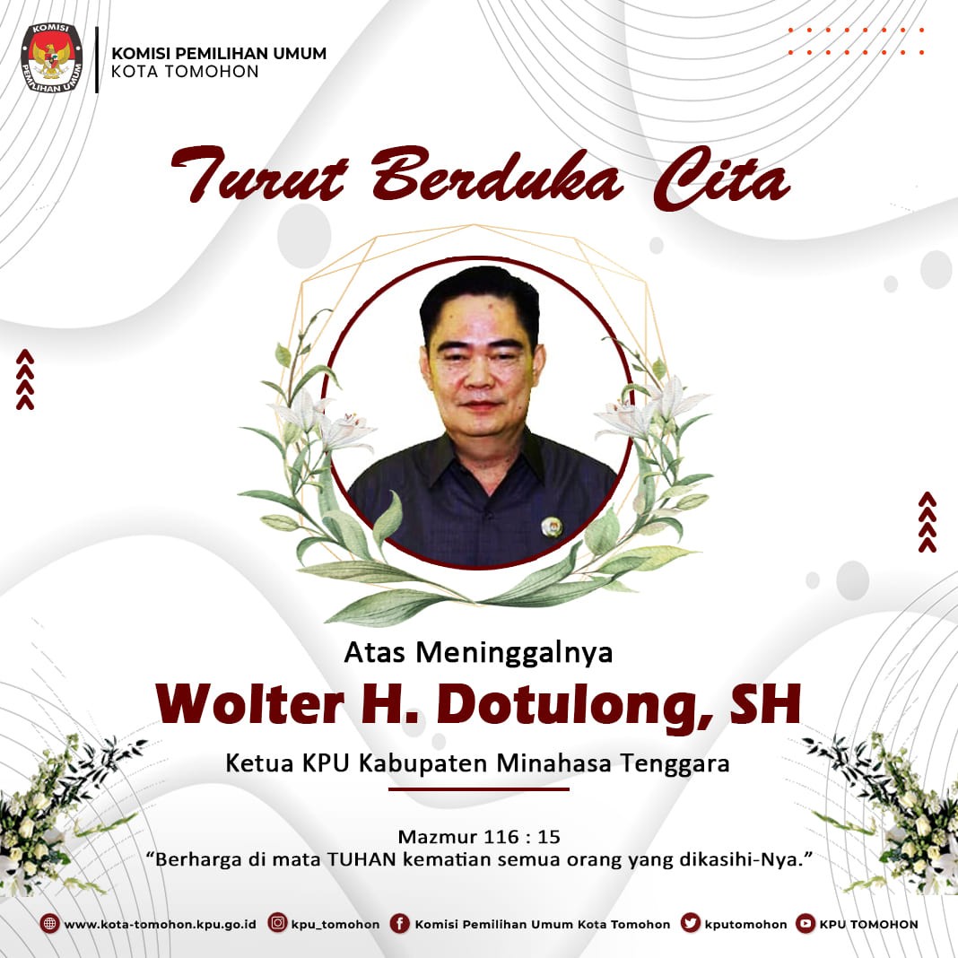 Keluarga Besar Komisi Pemilihan Umum Kota Tomohon menyampaikan Turut Berduka Cita atas meninggalnya Ketua Komisi Pemilihan Umum Kabupaten Minahasa Tenggara Wolter H. Dotulong, SH. Semoga keluarga yang ditinggkalkan diberikan kekuatan dan ketabahan.