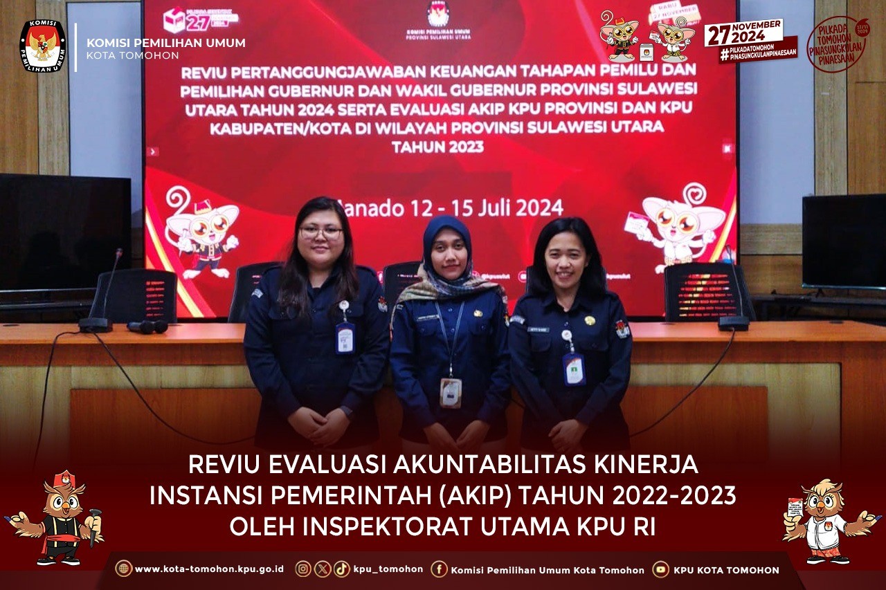 Tomohon, kota-tomohon.kpu.go.id - KPU Kota Tomohon mengikuti Kegiatan Evaluasi Akuntabilitas Kinerja Instansi Pemerintah (AKIP) tahun 2022-2023 pada KPU Provinsi/Kabupaten/Kota di Wilayah Provinsi Sulawesi Utara oleh Inspektorat Utama KPU RI, bertempat di Aula KPU Provinsi Sulawesi Utara, Sabtu (13/07/2024).