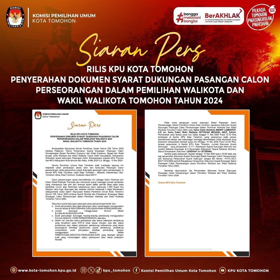 Rilis KPU Kota Tomohon Penyerahan Dokumen Syarat Dukungan Pasangan Calon Perseorangan dalam Pemilihan Walikota dan Wakil Walikota Tomohon Tahun 2024