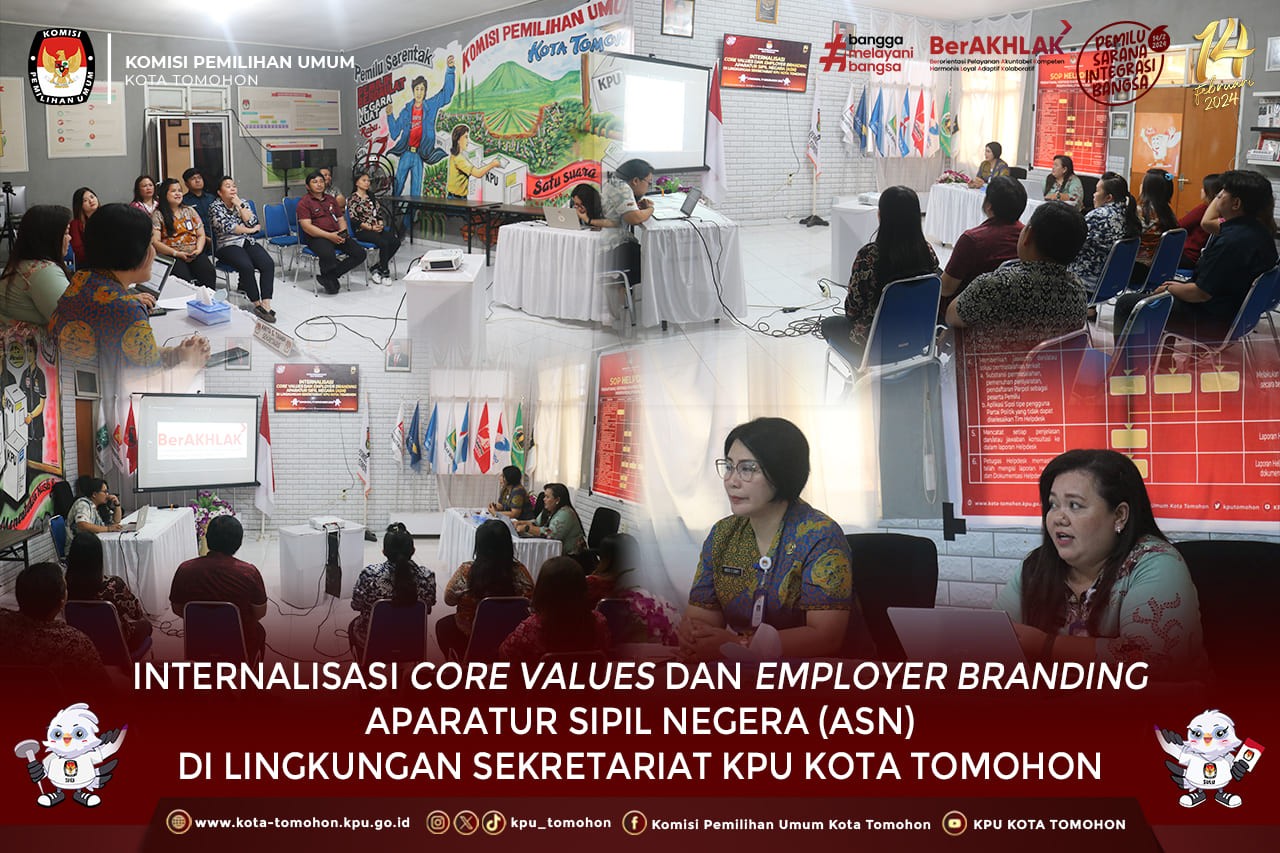 Tomohon, kota-tomohon.kpu.go.id - Sekretariat KPU Kota Tomohon melaksanakan Internalisasi Core Values ASN BerAKHLAK di ruang rapat kantor KPU Tomohon, Jumat (17/11/2023).