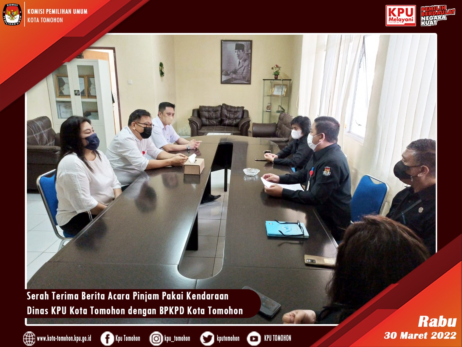 Tomohon, kota-tomohon.kpu.go.id - Rabu 30 Maret 2022 bertempat di KPU Kota Tomohon, Sekretaris Stella Sompe bersama para kasubbag menerima Berita Acara pinjam pakai kendaraan dinas dari BPKPD Kota Tomohon.