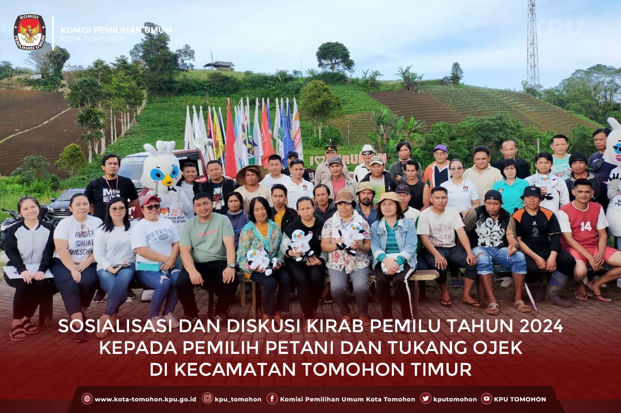 Tomohon, kota-tomohon.kpu.go.id - Sosialisasi Kirab Pemilu 2024 pada hari ini tertuju kepada Pemilih Petani dan Tukang Ojek yang ada dikecamatan Tomohon Timur tepatnya di Pintu Masuk Objek Wisata Gunung Mahawu dan dihadiri langsung oleh Bapak Sekretaris Kecamatan Tomohon Timur, PPK dan PPS Kecamatan Tomohon Timur, serta para Pemilih Petani yang ada dikecamatan Tomohon Timur. Dalam kegiatan sosialisasi di awali dengan doa buka yang dipimpin oleh Bapak Meine Wengkang dan selanjutnya sambutan yang disampaikan langsung oleh Sekretaris Kecamatan Tomohon Timur yang disampaikan langsung oleh Bapak Drs. Jhony Pangemanan.
