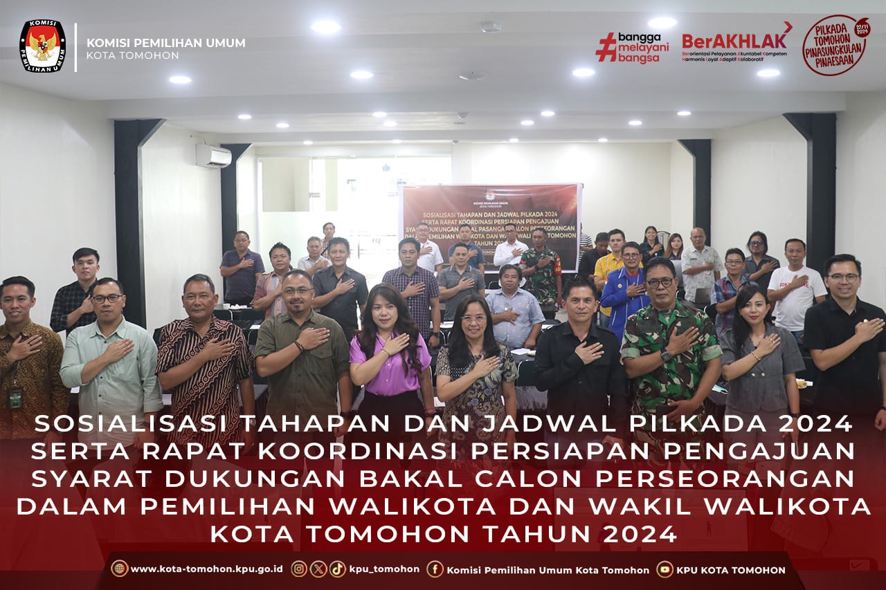 Sosialisasi Tahapan dan Jadwal Pilkada 2024 serta Rakor Persiapan Pengajuan Syarat Dukungan Bakal Calon Perseorangan Dalam Pemilihan Walikota dan Wakil Walikota Tomohon Tahun 2024