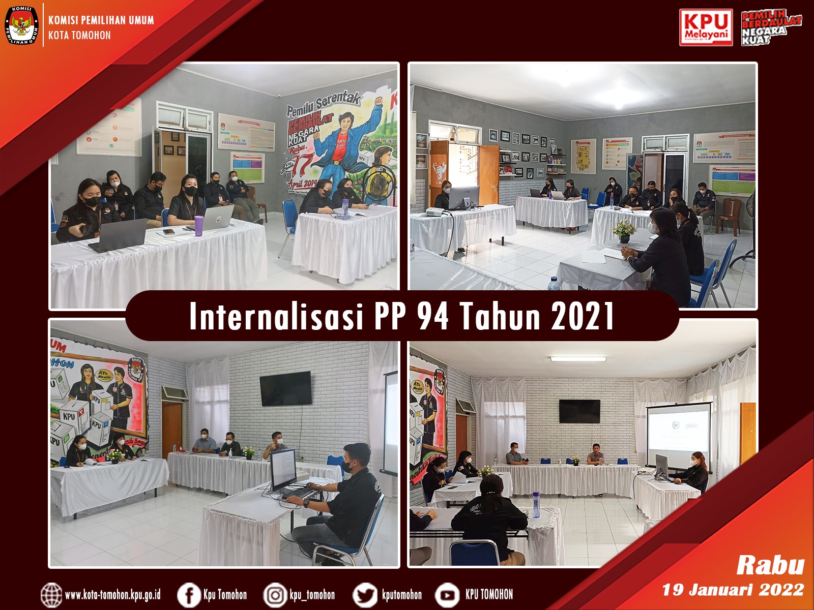 Tomohon, kota-tomohon.kpu.go.id - KPU Kota Tomohon melaksanakan Internalisasi Perarturan Pemerintah Nomor 94 Tahun 2021 tentang Disiplin Pegawai Negeri Sipil (19/01). Kegiatan dibuka oleh Sekretaris KPU Kota Tomohon Stella Sompe, dilanjutkan arahan oleh Ketua Divisi Sosialisasi, Pendidikan Pemilih, Partisipasi Masyarakat dan SDM Stenly Kowaas. Hadir juga ketua KPU Harryanto Lasut dan anggota KPU Robby Golioth serta Jacobus Wowor.