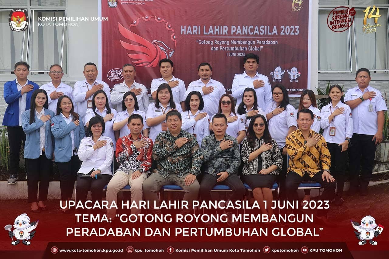 Tomohon, kota-tomohon.kpu.go.id - KPU Tomohon menggelar Upacara Peringatan Hari Lahir Pancasila 1 Juni 2023 dengan Tema: "Gotong Royong Membangun Peradaban dan Pertumbuhan Global" bertempat di Kantor KPU Kota Tomohon. Ketua KPU Kota Tomohon Harryanto Lasut menjadi Pembina Upacara dan Sekretaris Stella Sompe menjadi Pemimpin Upacara. Upacara diikuti oleh Komisioner beserta seluruh Jajaran Sekretariat KPU Kota Tomohon.