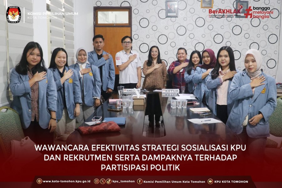 Ketua KPU Tomohon Albertien G.V. Pijoh dan Ketua Divisi Sosialisasi, Pendidikan Pemilih, Partisipasi Masyarakat dan Sumber Daya Manusia (Sosdiklih, Parmas dan SDM) Rojer R. Datu didampingi Kepala Sub Bagian Hukum dan SDM Greis Winda Tamba menerima dan memulai sesi wawancara dengan delapan orang Mahasiswa tersebut dimana sesuai surat yang disampaikan sebelumnya, wawancara ini dalam rangka penyelesaian tugas Studi Kasus mata kuliah Sistem Politik Indonesia.