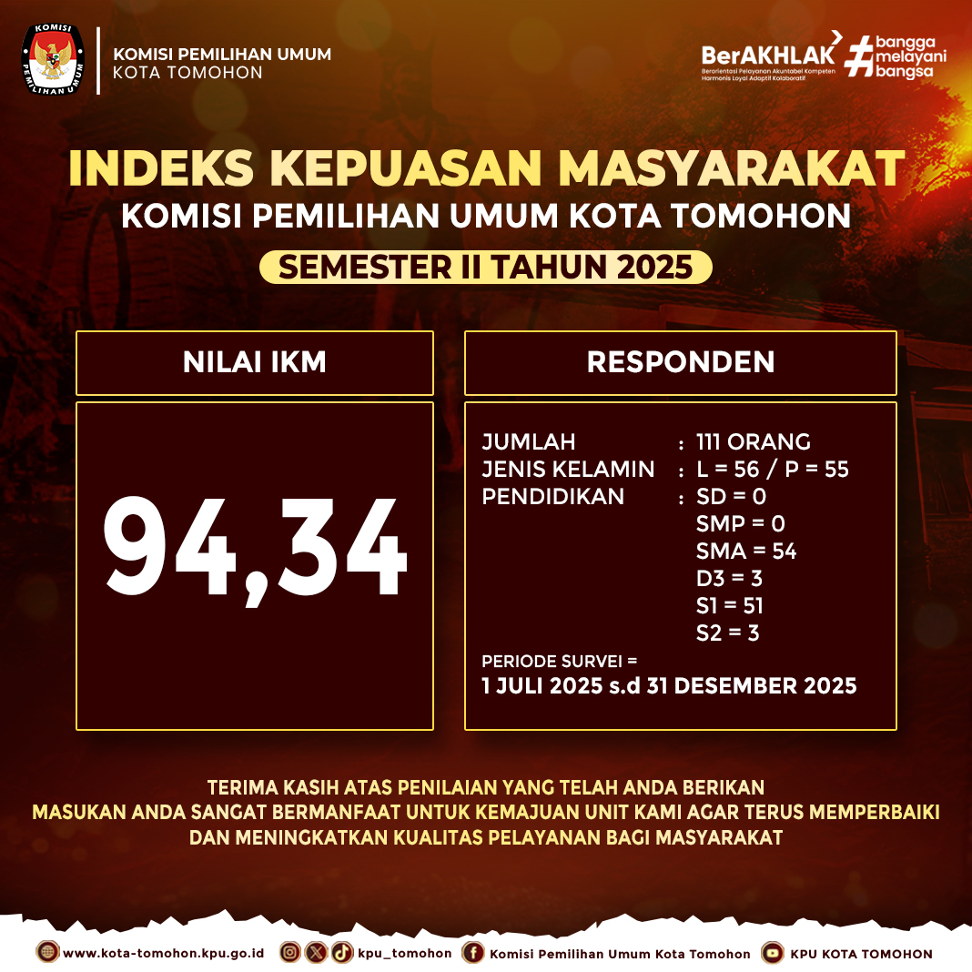 - Nilai IKM pada KPU Kota Tomohon periode Semester II Tahun 2025 (Juli-Desember) sebeser 3,77 dengan persentase 94,34% berada pada kategori "Sangat Baik". link