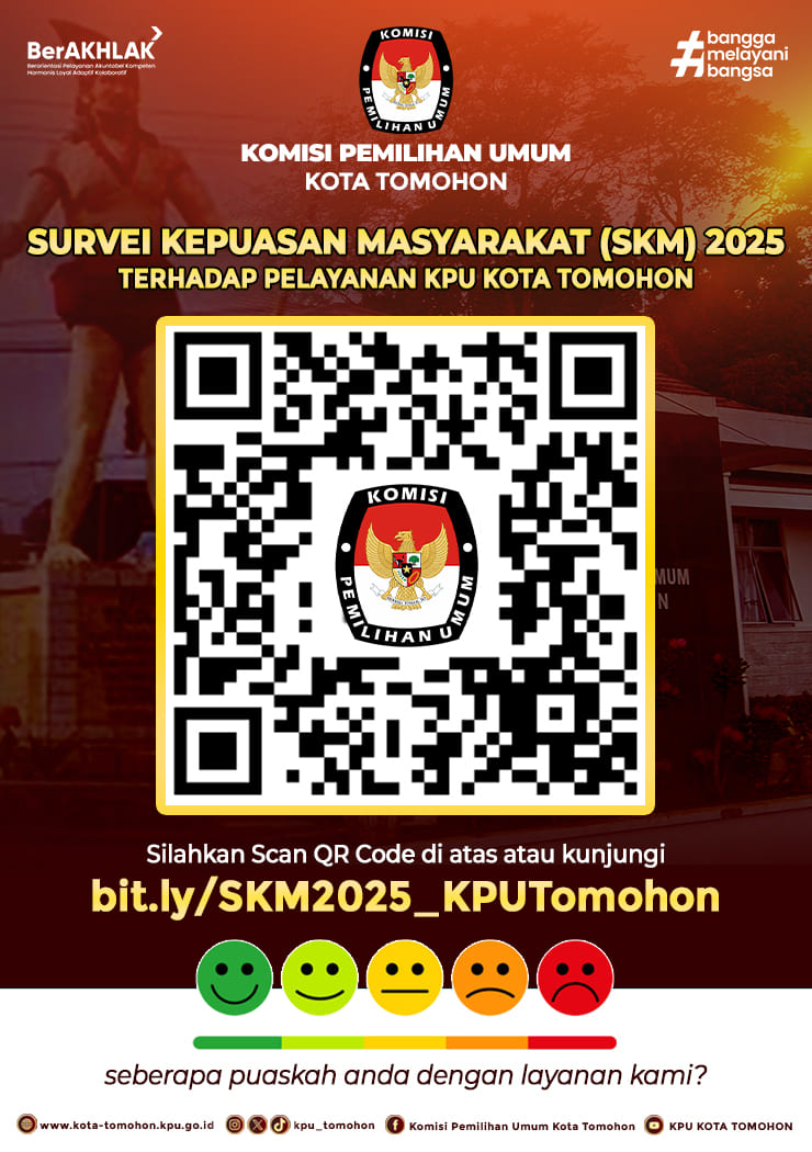 Survey Kepuasan Masyarakat (SKM) dilakukan untuk mengukur tingkat kepuasan masyarakat terhadap pelayanan publik yang diberikan oleh Komisi Pemilihan Umum (KPU) Kota Tomohon. http://bit.ly/SKM2025_KPUTomohon