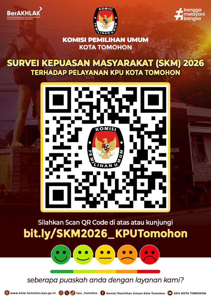 Survey Kepuasan Masyarakat (SKM) dilakukan untuk mengukur tingkat kepuasan masyarakat terhadap pelayanan publik yang diberikan oleh Komisi Pemilihan Umum (KPU) Kota Tomohon. http://bit.ly/SKM2026_KPUTomohon